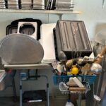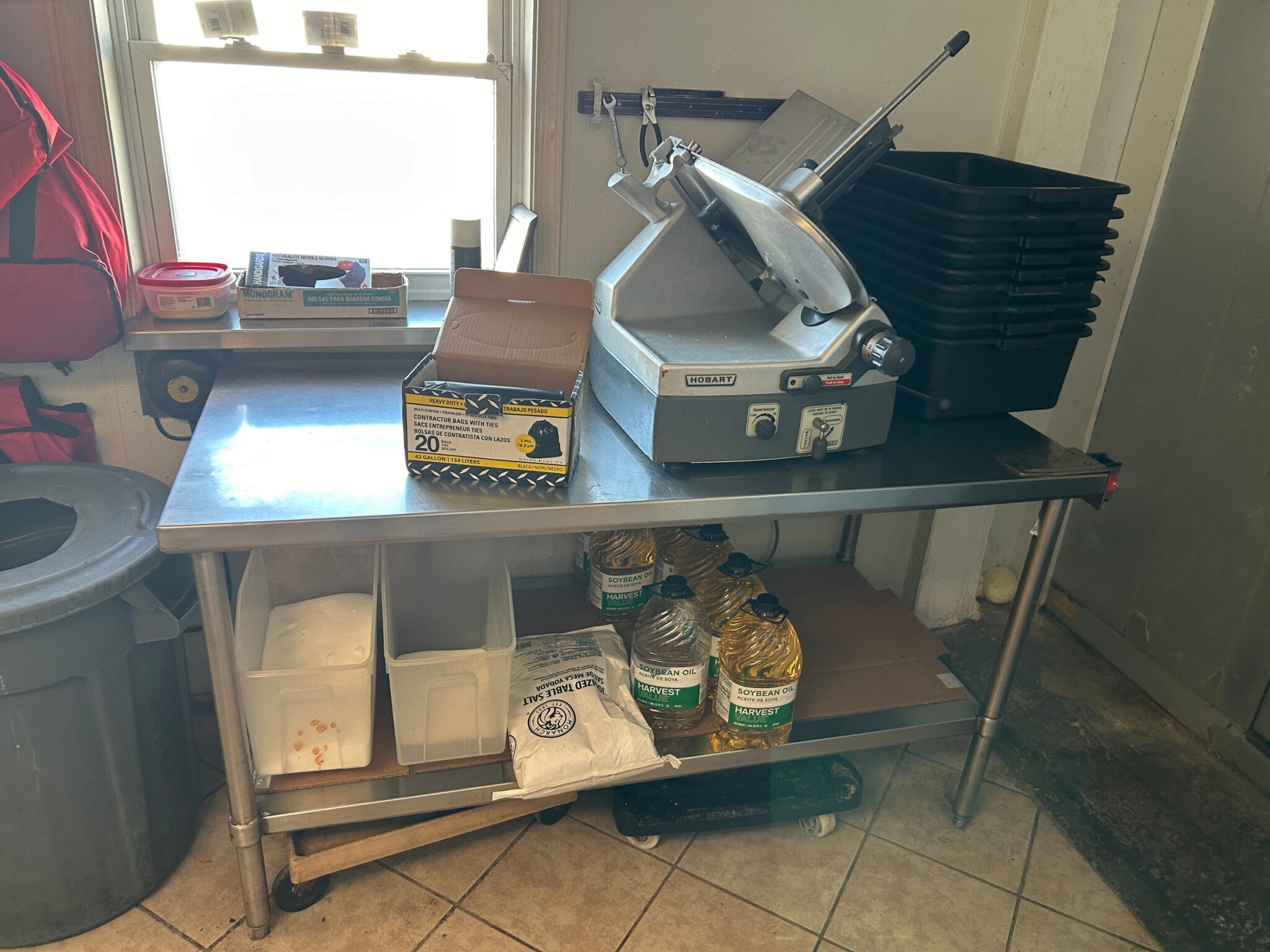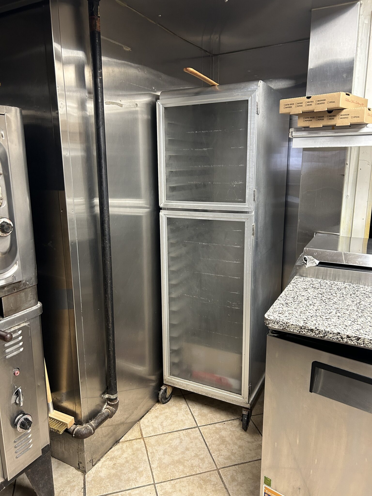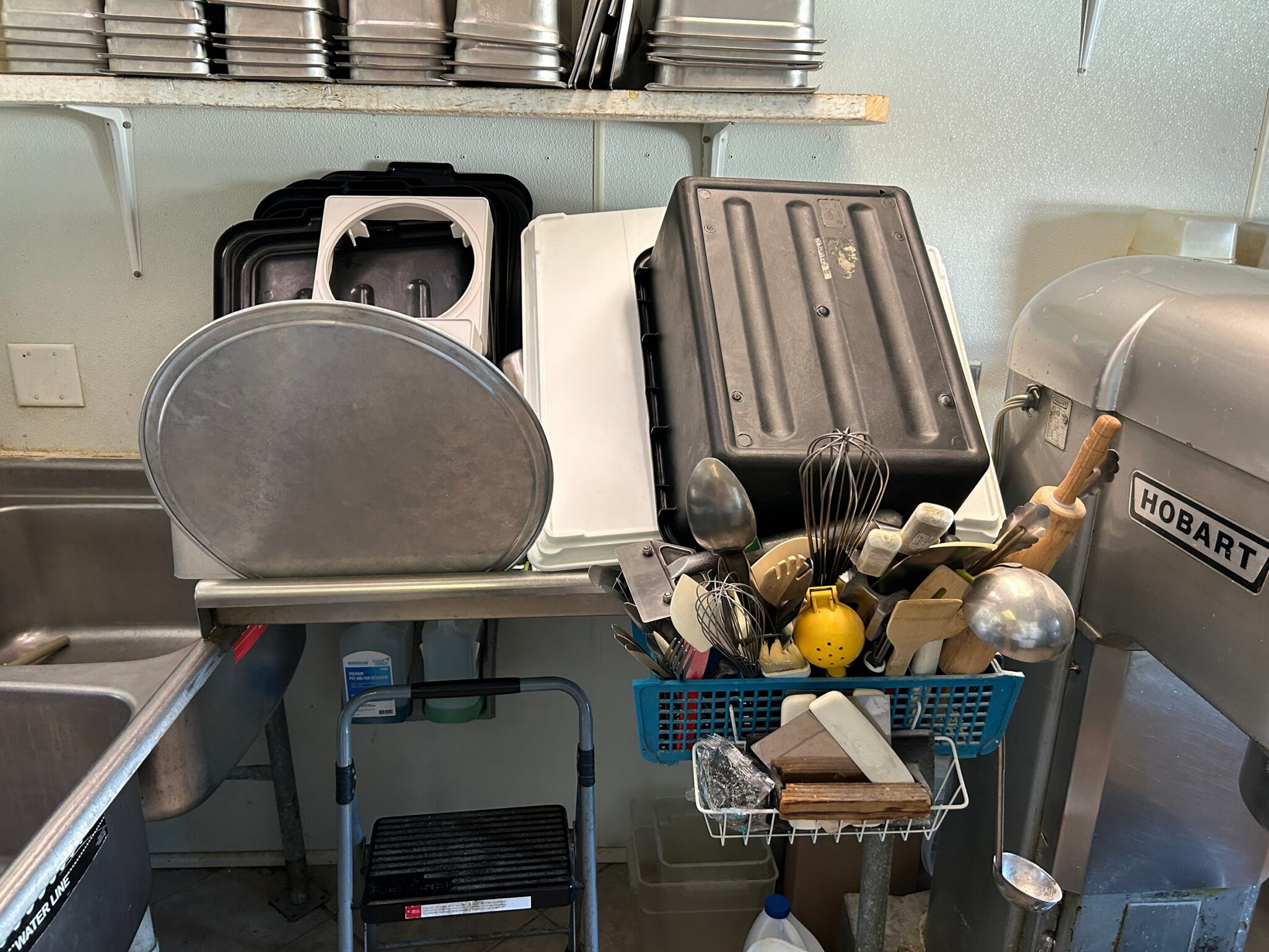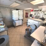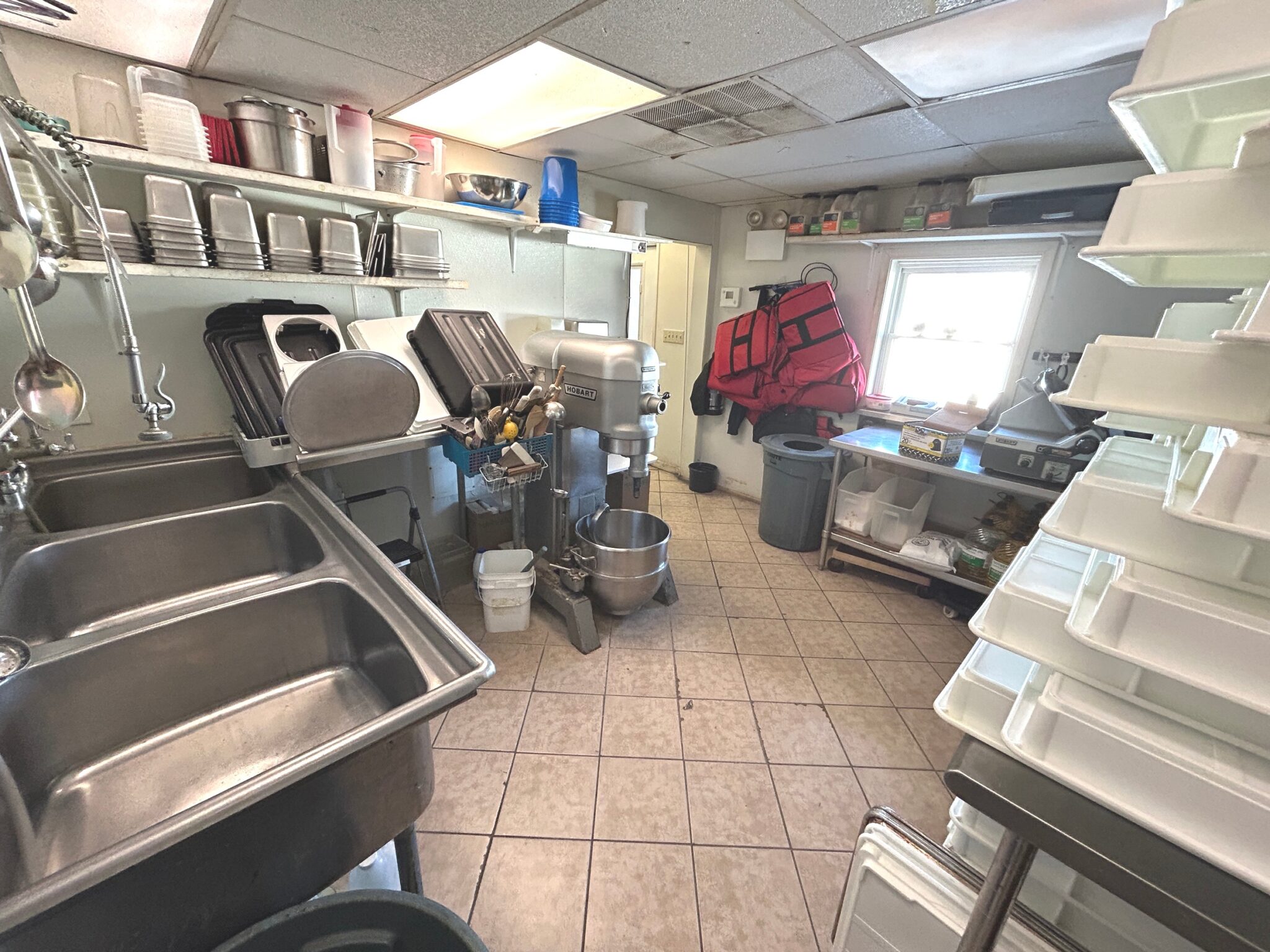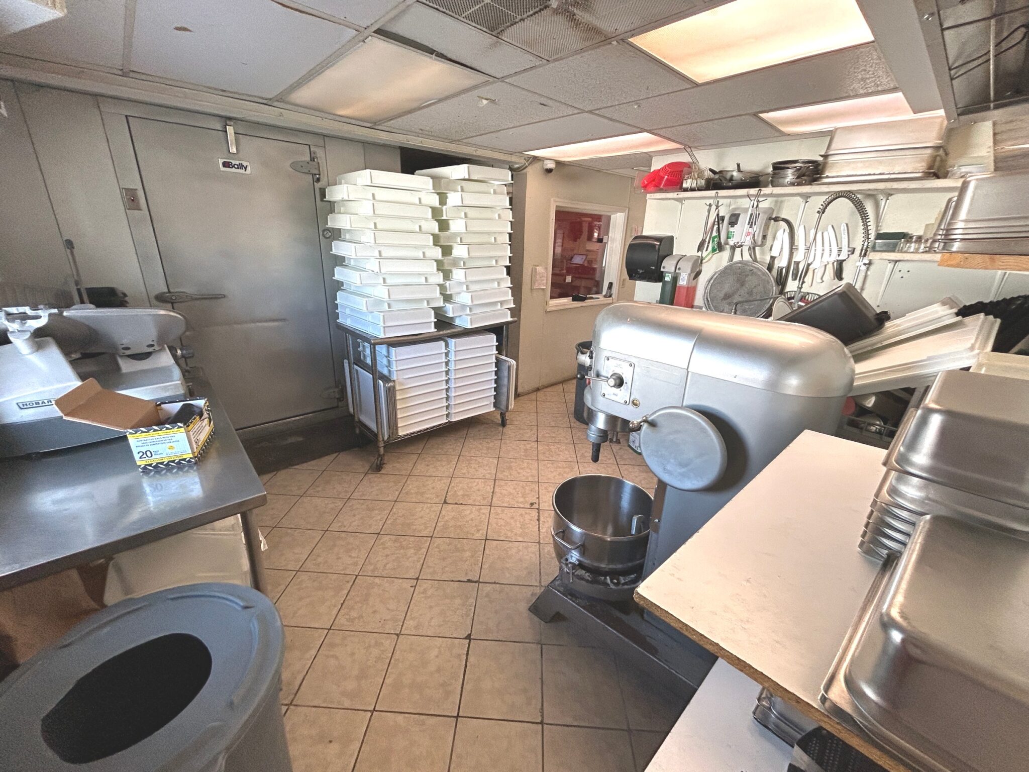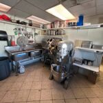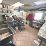 - Dish Room: 12’x13’ – Tile Flooring, 6’x7’ Bally Walk in Freezer, 3-Compartment Stainless Steel Sink, Large Hobart Mixer, Hobart Meat Slicer, (2) Stainless Steel Tables, Multiple Dishes, Pans, Utensils & Accessories to go along with the restaurant.