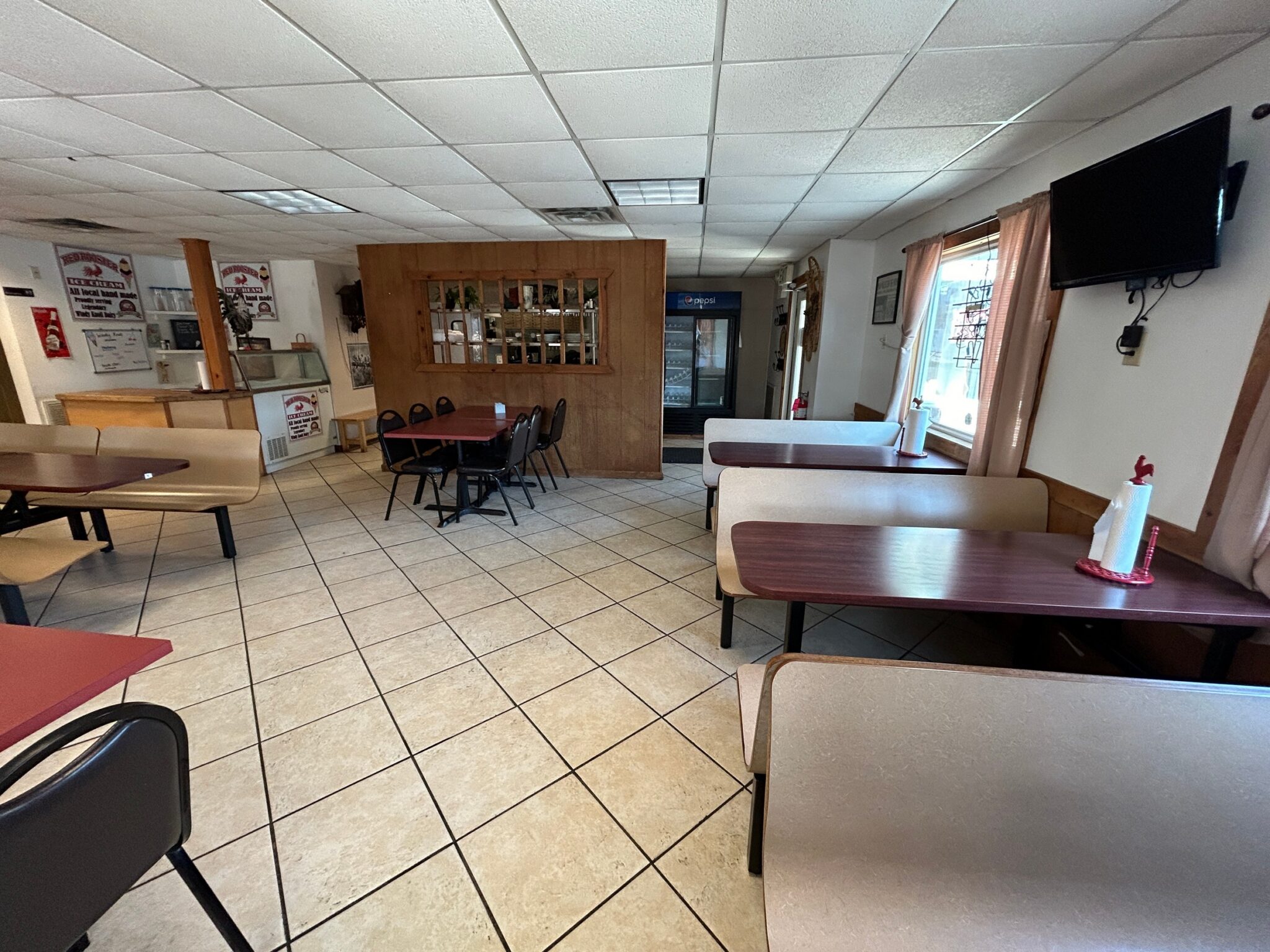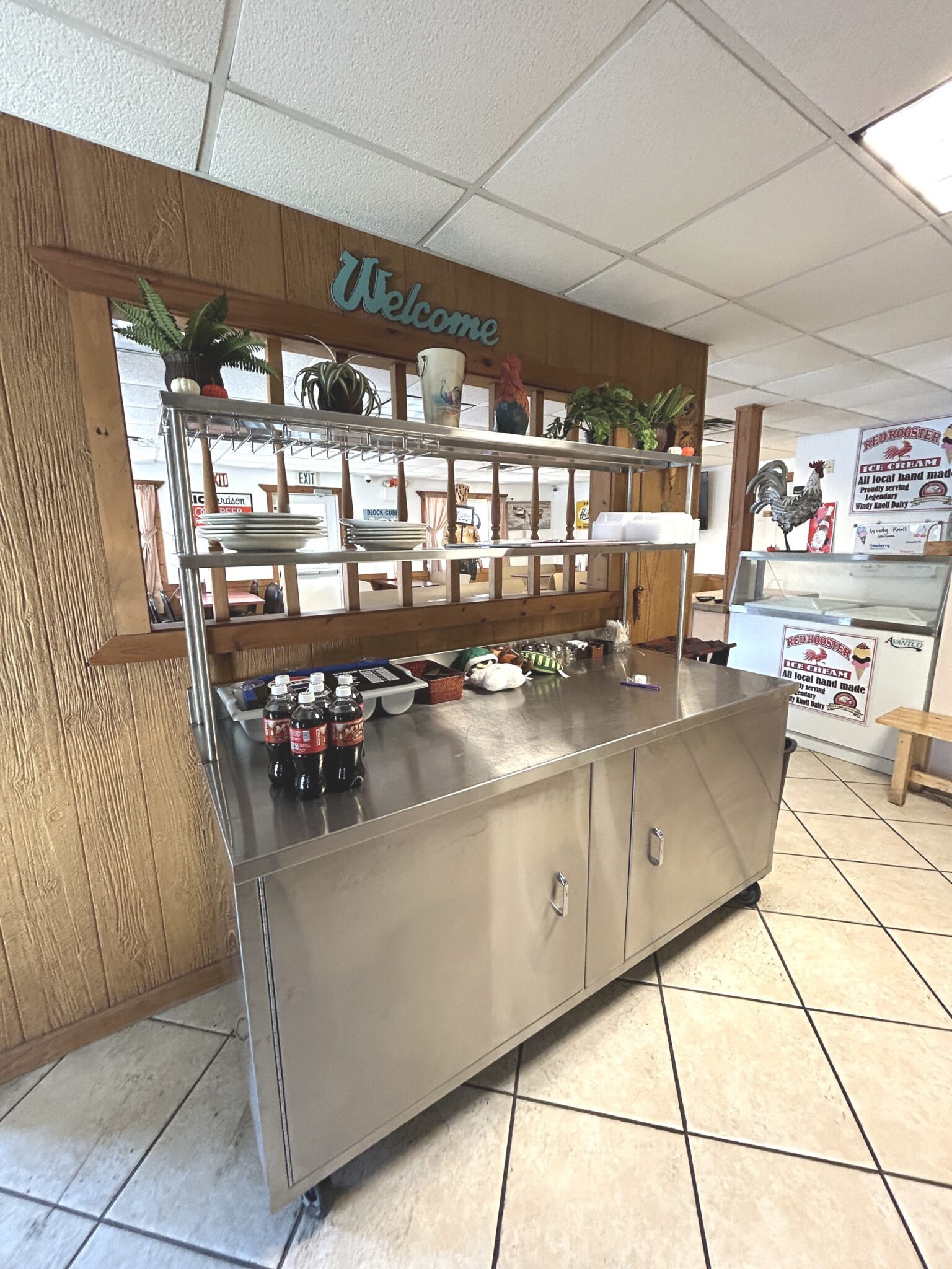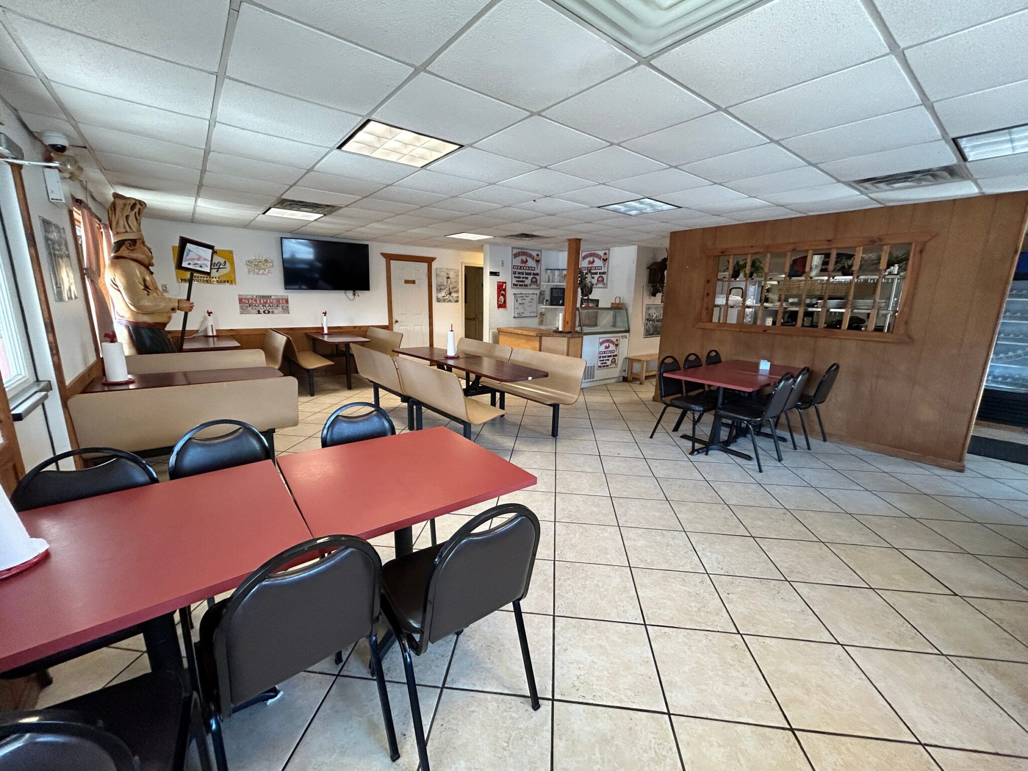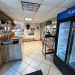 - Service Counter: 19’x10’ – Tile Flooring, Pepsi Self-Serve Cooler, 6’x2.5’ Stainless Steel Cabinet with Racking and Storage, Entrance to Kitchen, Dining Area, Ice Cream Bar & Outside Vestibule Entrance.