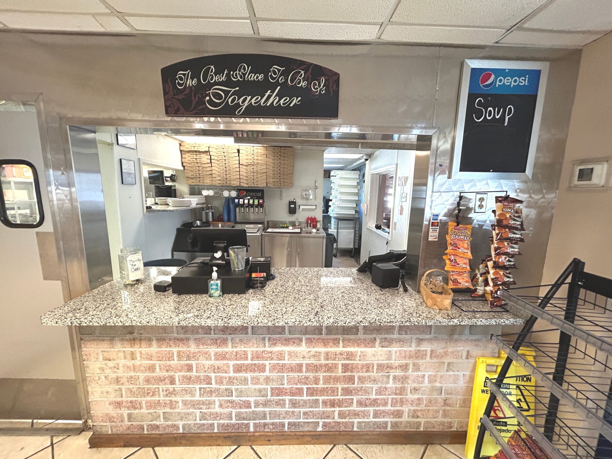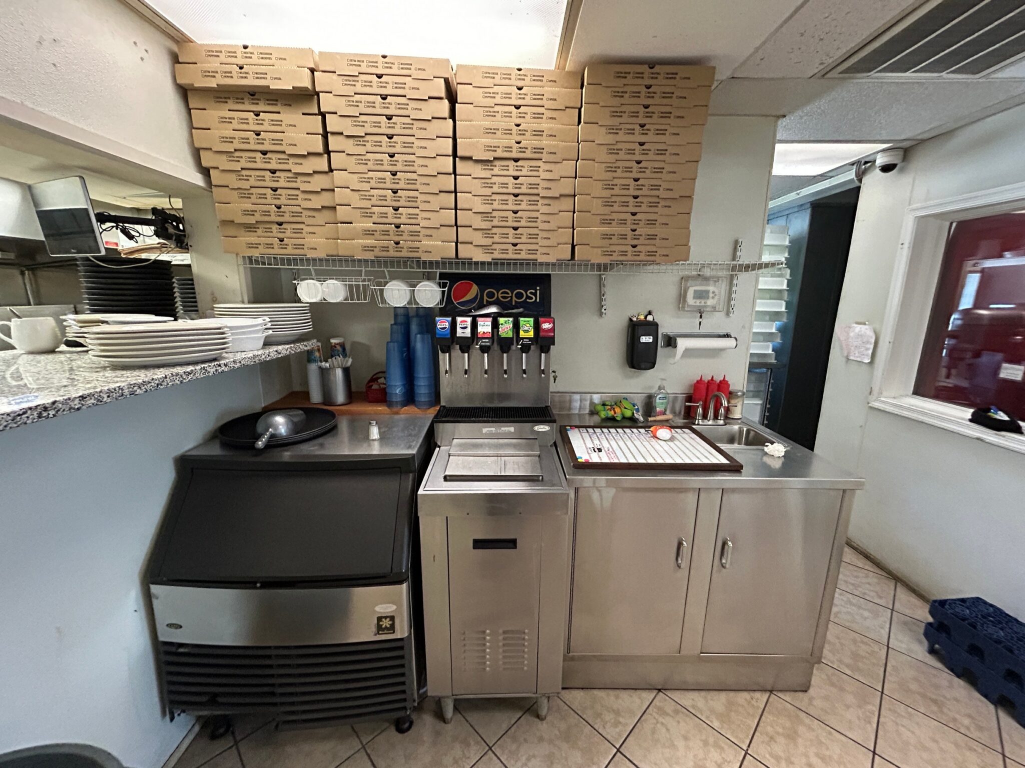 - Service Counter Room: 10’x10’ – Tile Flooring, Granite Countertop, Ice Machine, Pepsi Fountain Machine, Single Sink, (2) Toast POS Systems.