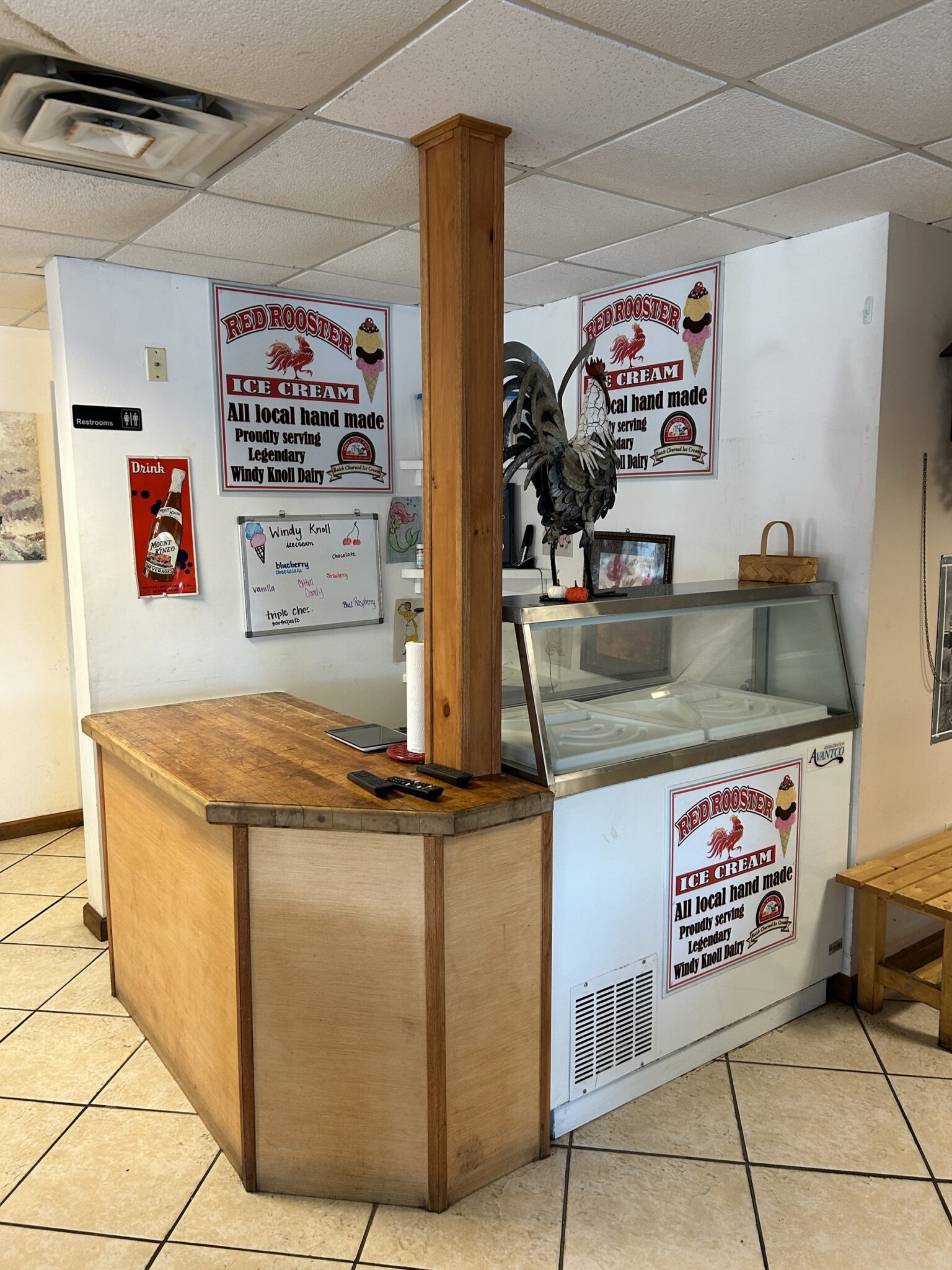- Ice Cream Counter: 5’x5’ – Tile Flooring, Wood Cabinet, Hand Dipped Ice Cream Cooler.